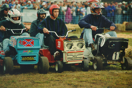 Lawnmower racing originated in Britain, where according to the British Lawn Mower Racing Association, villagers at the Criketers Arms Pub in Wisborough Green, West Sussex, “Whilst downing their pints … looked across the village green to see the green keeper mowing the cricket pitch. They realised that everyone had a lawn mower in their garden shed and it was then that Lawn Mower racing was born. A Championship was held in a local farmers field and up to 80 competitors turned up for what turned out to be a very successful event.”